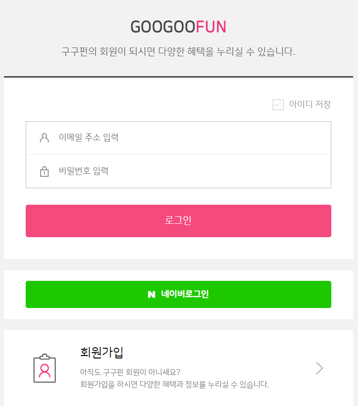구구펀에 접속하고 나면 아래와 같은 화면이 나오게 되는데 일단 회원가입을 하자.