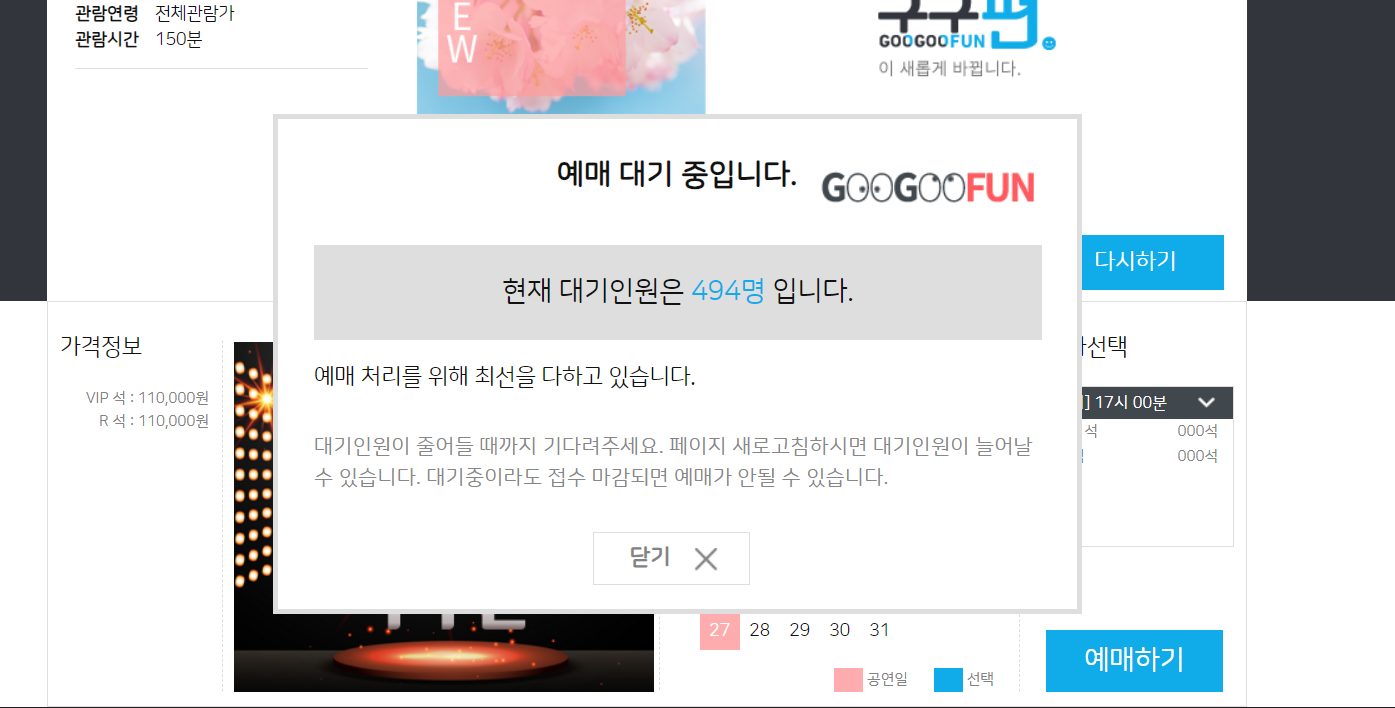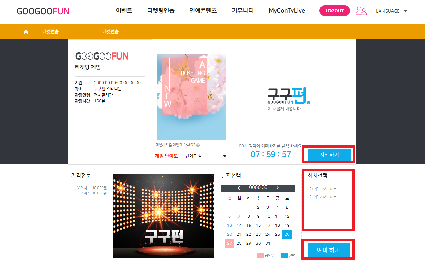 정해진 시간에 들어가서 예매하기를 누른 이후 어떤식으로 화면이 나오며 어떤걸 눌러야 실패 없는 티켓팅이 가능한지 일종의 시뮬레이션을 해볼 수 있는 구구펀을 활용해보자.