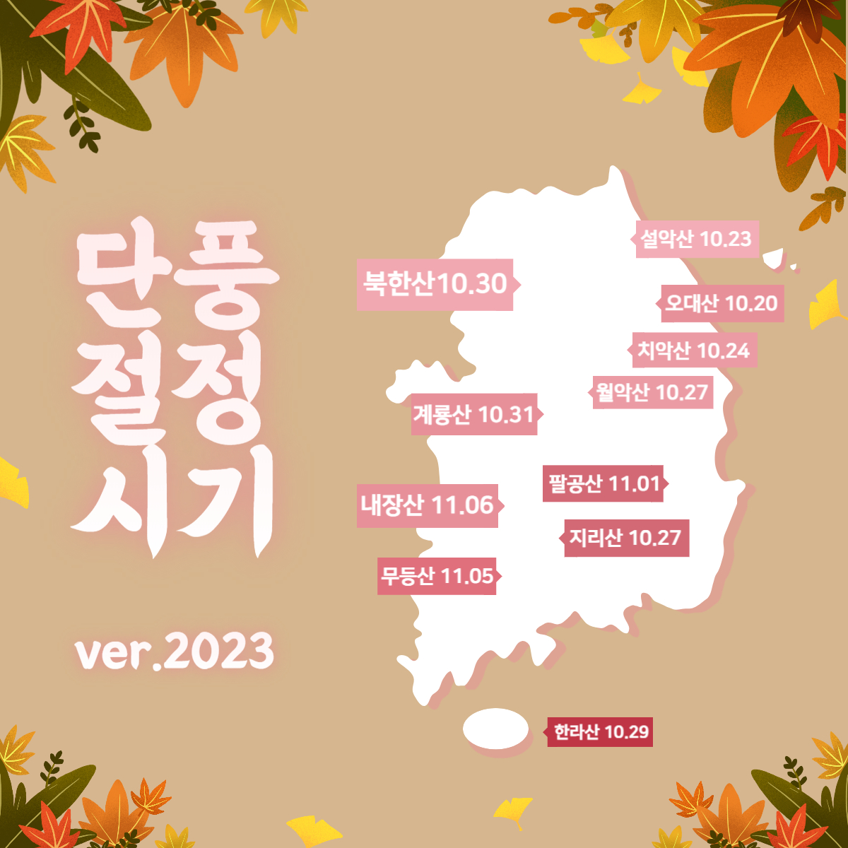 | 내장산 | 10.26 | 11.06 | 북한산 | 10.19 | 10.30 |